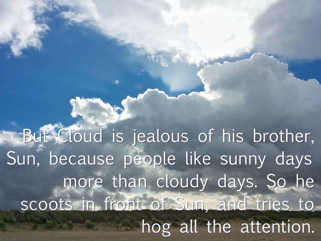 But Cloud is jealous of his brother, Sun, because people like sunny days more than cloudy days. So he scoots in front of Sun, and tries to hog all the attention.