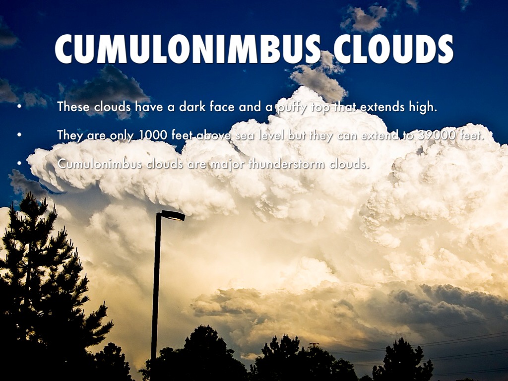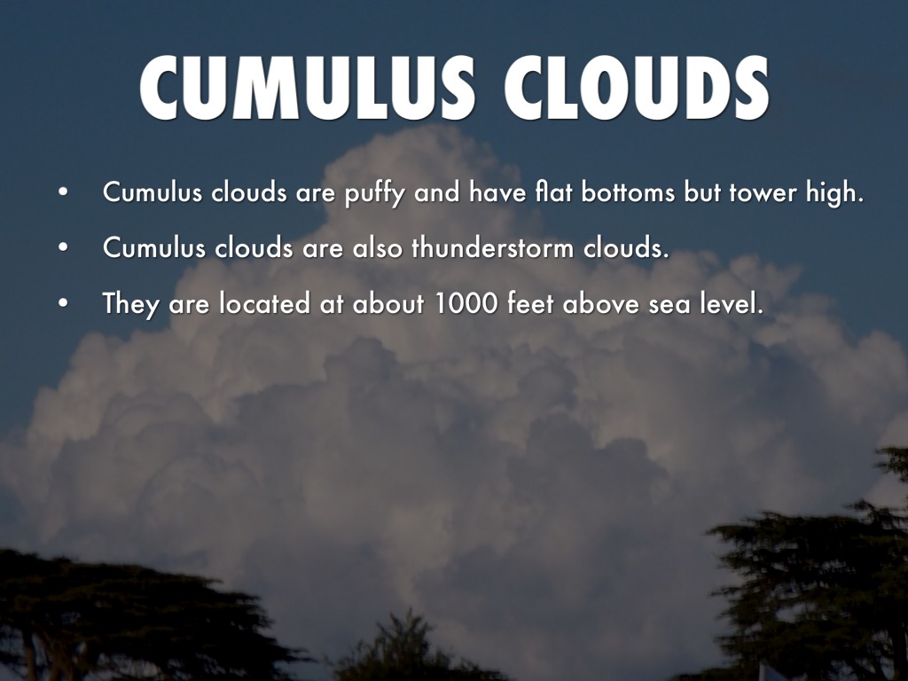 Cumulus clouds are puffy and have flat bottoms but tower high.