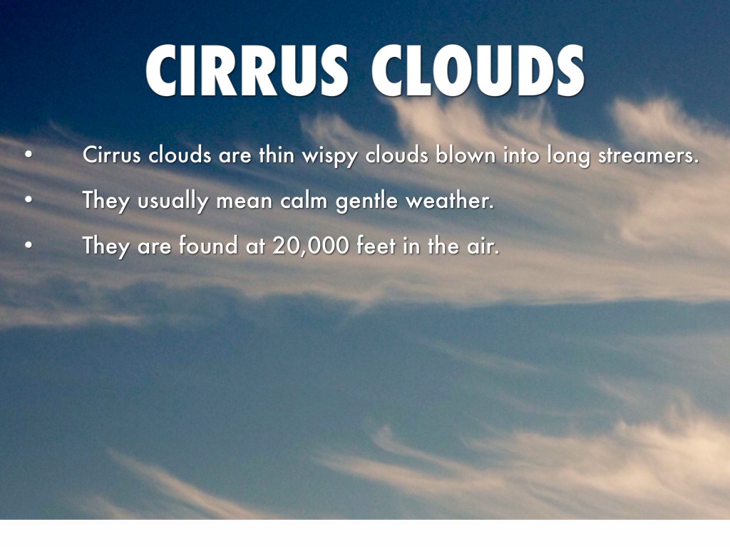 Cirrus clouds are thin wispy clouds blown into long streamers.