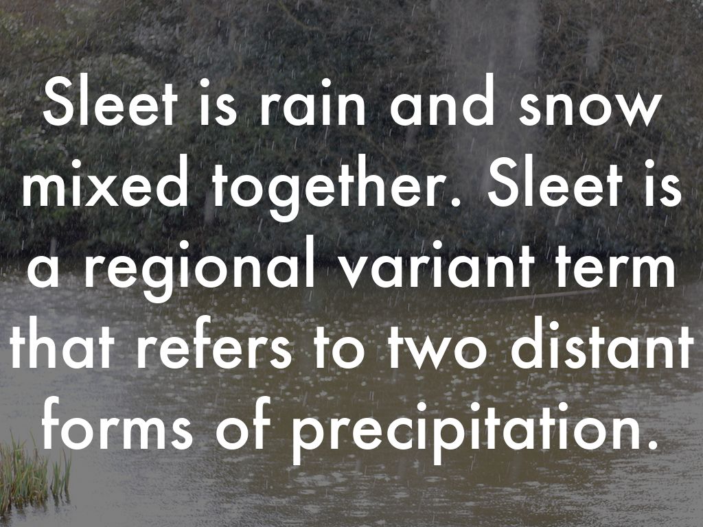 Sleet is rain and snow mixed together. Sleet is a regional variant term that refers to two distant forms of precipitation.