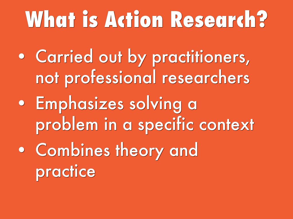"Action research has as its goal to address a specific problem within a specific setting, such as a classroom, a workplace, a program, or an organization. This kind of research often involves the participants in the research process, thus blurring the distinction between action and research. Further, while some training in research is helpful, action research is often conducted by people in the 'real world' who are interested in practical solutions to problems and who are interested in social change" -Robert Stake