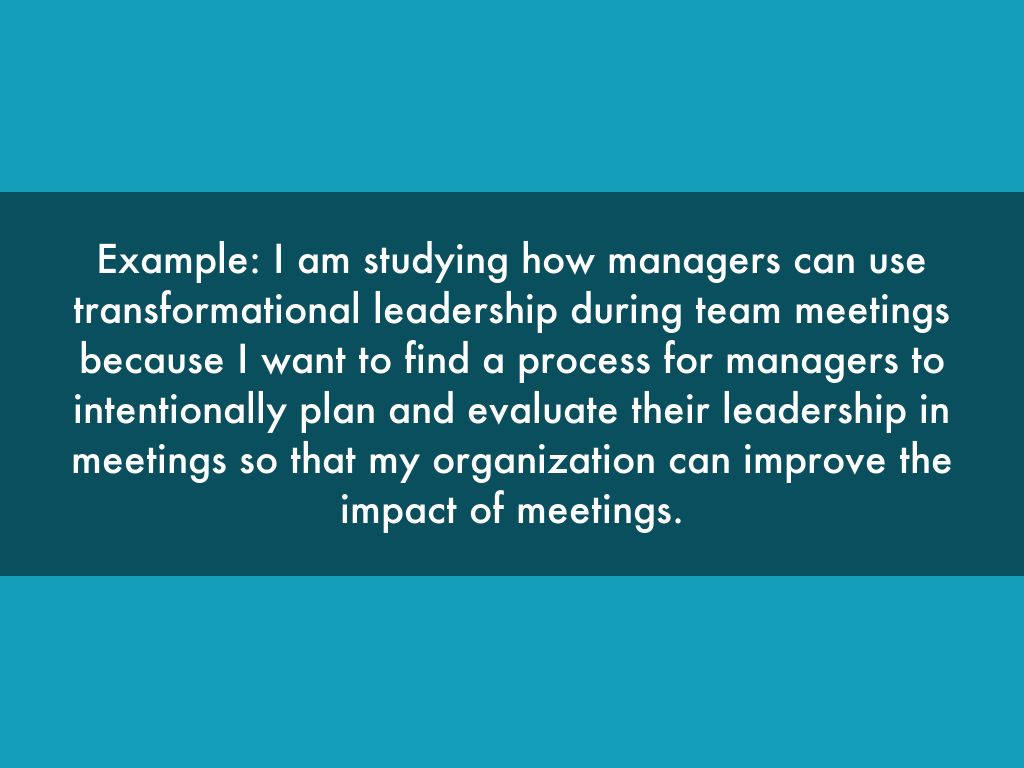 Example: Because I value leadership that helps people internalize core values, I want to study how managers can use transformational leadership during team meetings so that I can improve how managers plan and evaluate their meetings in order to help both managers and followers internalize core values.