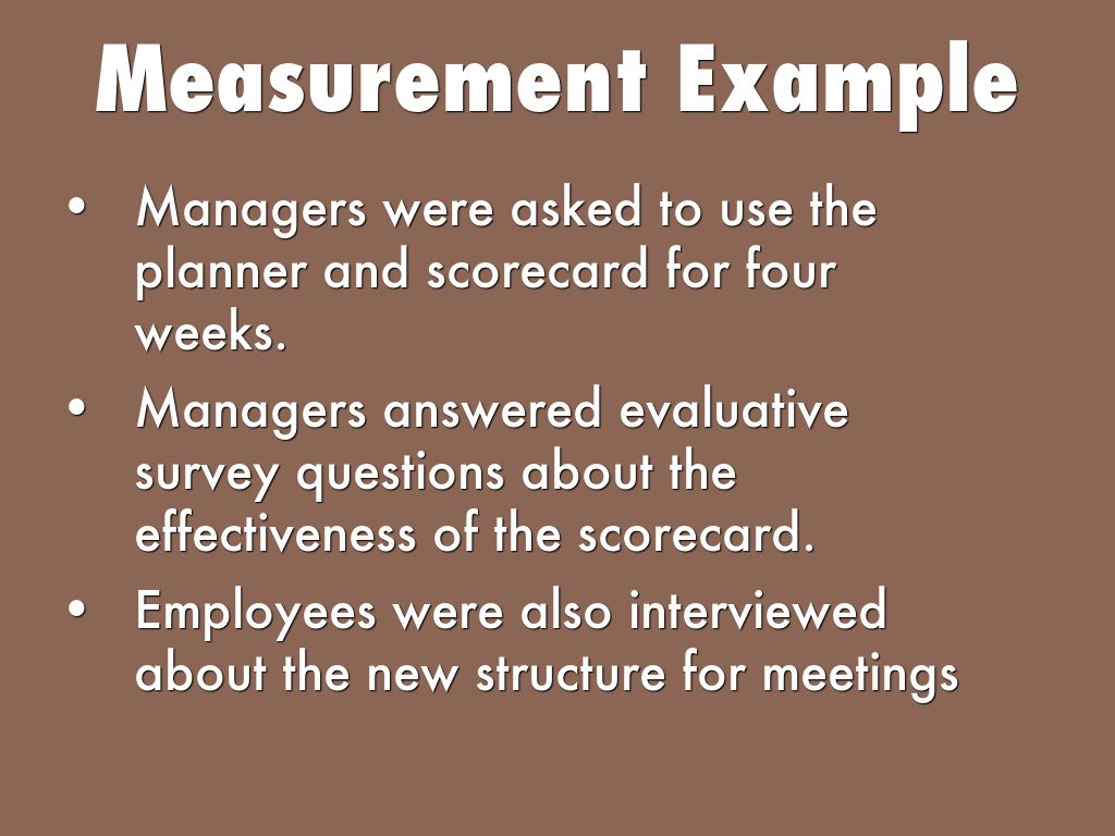 - Managers answered evaluative survey questions about the effectiveness of the scorecard.