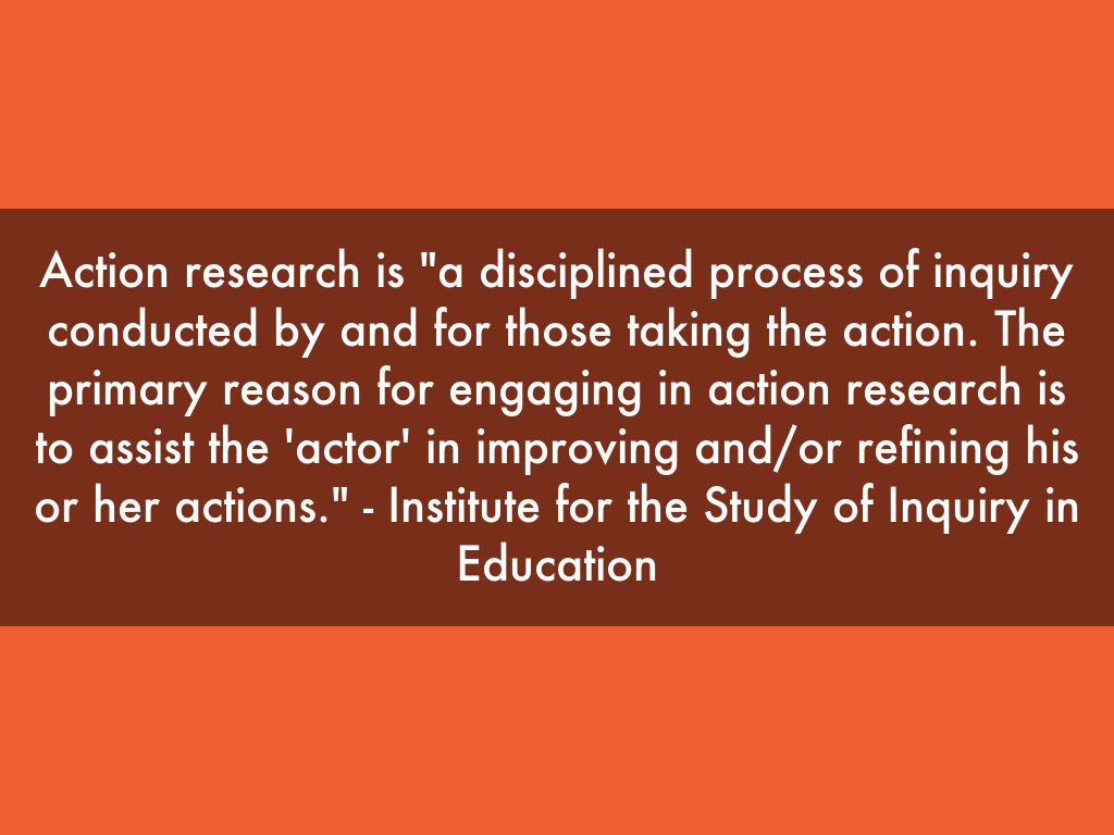 Action research is "a disciplined process of inquiry conducted by and for those taking the action. The primary reason for engaging in action research is to assist the 'actor' in improving and/or refining his or her actions." - Institute for the Study of Inquiry in Education