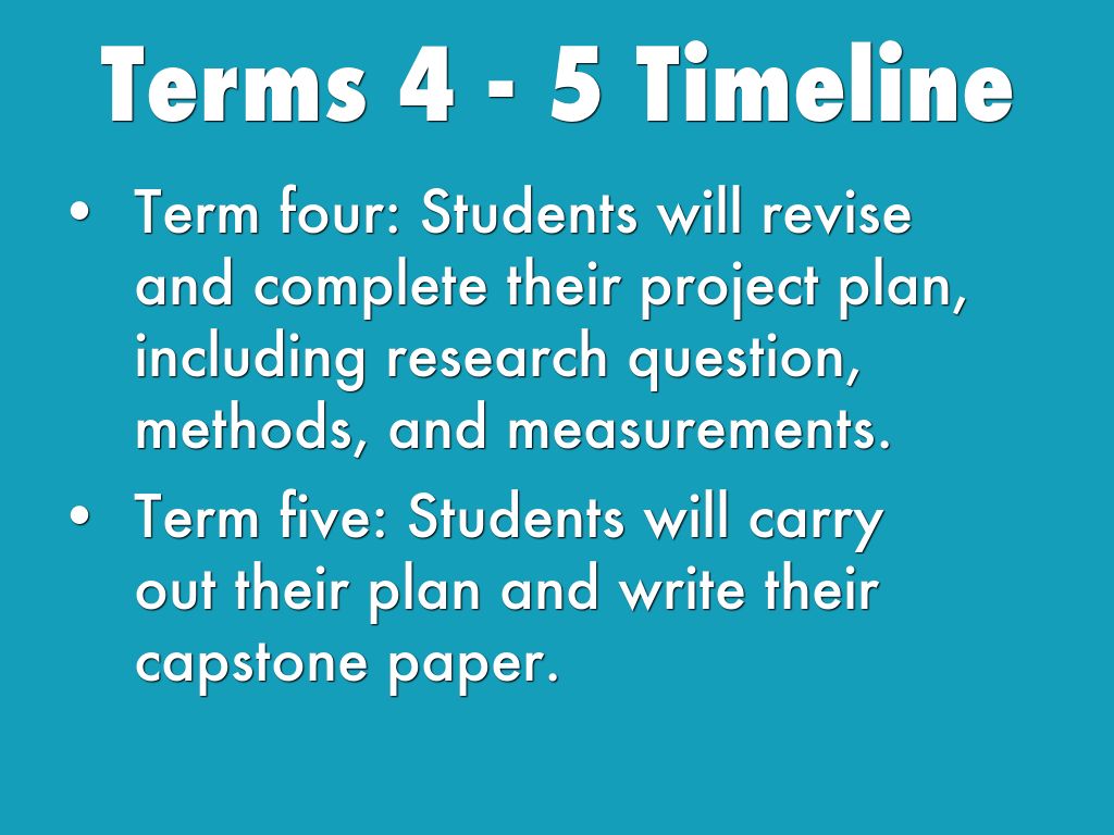 - Term four: Students will revise and complete their project plan, including research question, methods, and measurements.