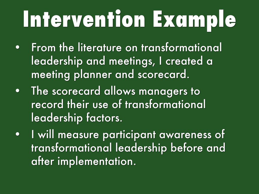 - I will measure participant awareness of transformational leadership before and after implementation.
