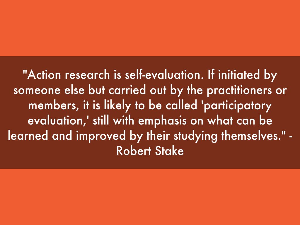 "Action research is self-evaluation. If initiated by someone else but carried out by the practitioners or members, it is likely to be called 'participatory evaluation,' still with emphasis on what can be learned and improved by their studying themselves." - Robert Stake