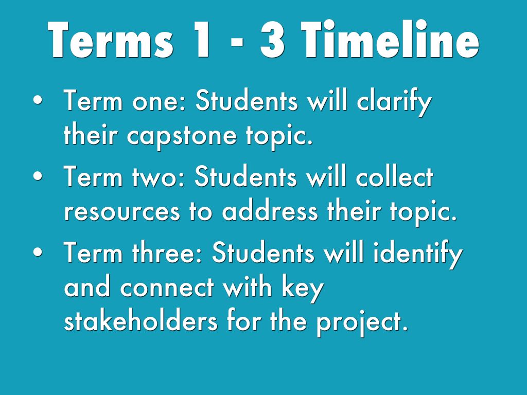 - Term three: Students will identify and connect with key stakeholders for the project.