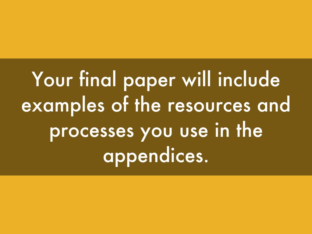 Your final paper will include examples of the resources and processes you use in the appendices.