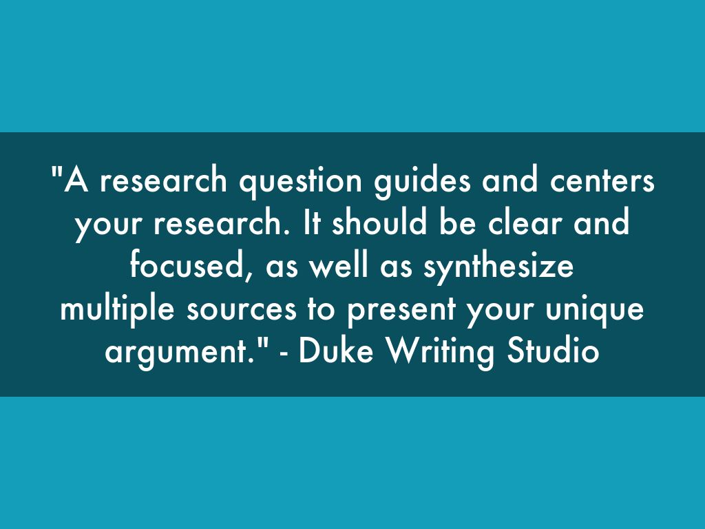 "A research question guides and centers your research. It should be clear and focused, as well as synthesize