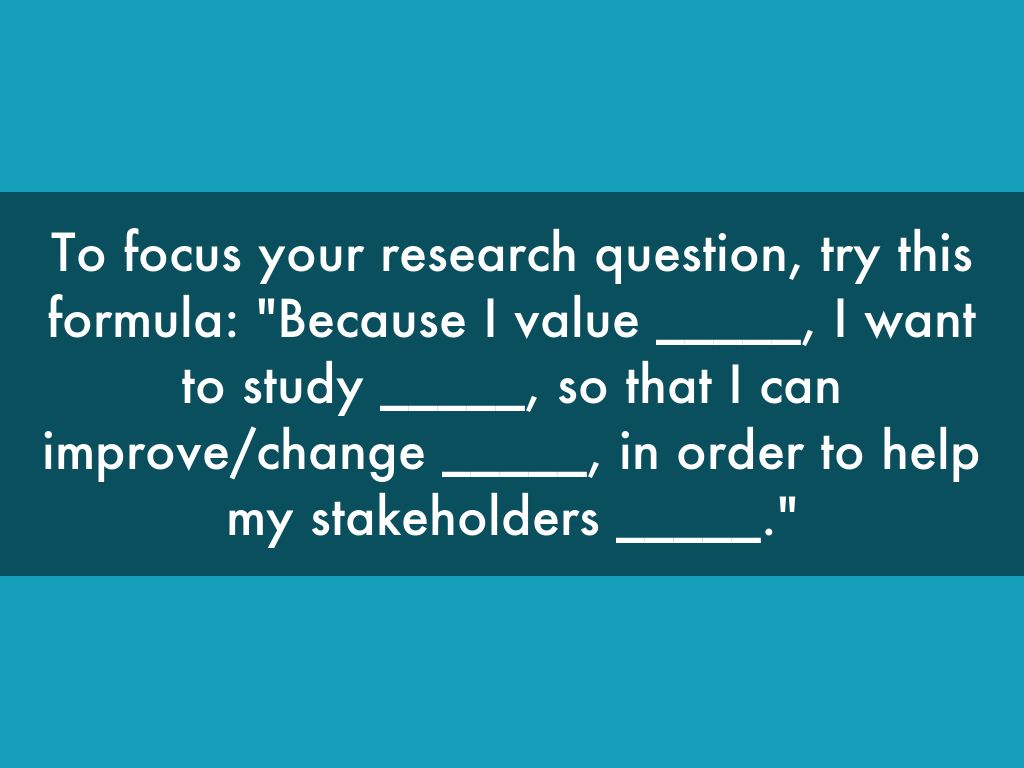 To focus your research question, try this formula: "Because I value _____, I want to study _____, so that I can improve/change _____, in order to help my stakeholders _____."