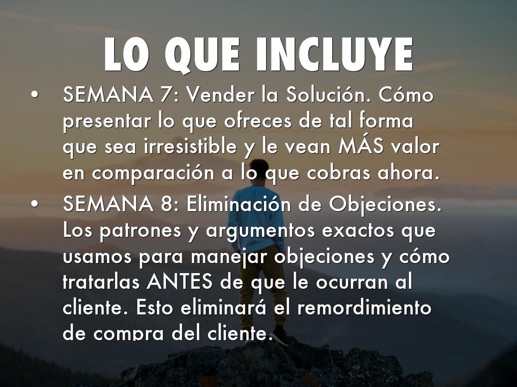 SEMANA 8: Eliminación de Objeciones. Los patrones y argumentos exactos que usamos para manejar objeciones y cómo tratarlas ANTES de que le ocurran al cliente. Esto eliminará el remordimiento de compra del cliente.