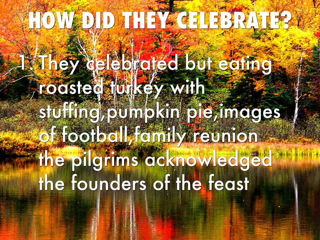 They celebrated but eating roasted turkey with stuffing,pumpkin pie,images of football,family reunion the pilgrims acknowledged the founders of the feast