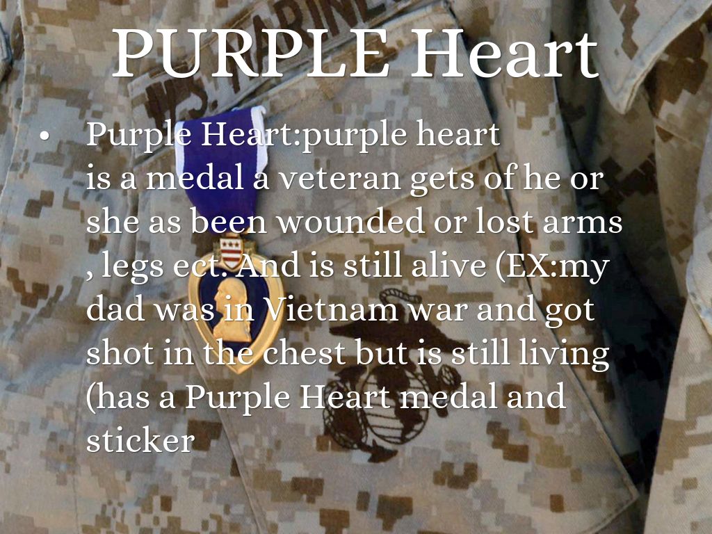 is a medal a veteran gets of he or she as been wounded or lost arms , legs ect. And is still alive (EX:my dad was in Vietnam war and got shot in the chest but is still living (has a Purple Heart medal and sticker