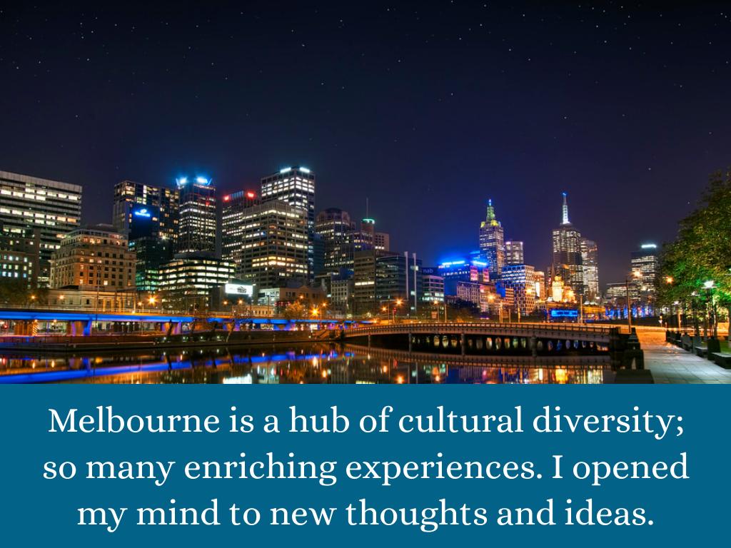 Melbourne is a hub of cultural diversity; so many enriching experiences. I opened my mind to new thoughts and ideas.