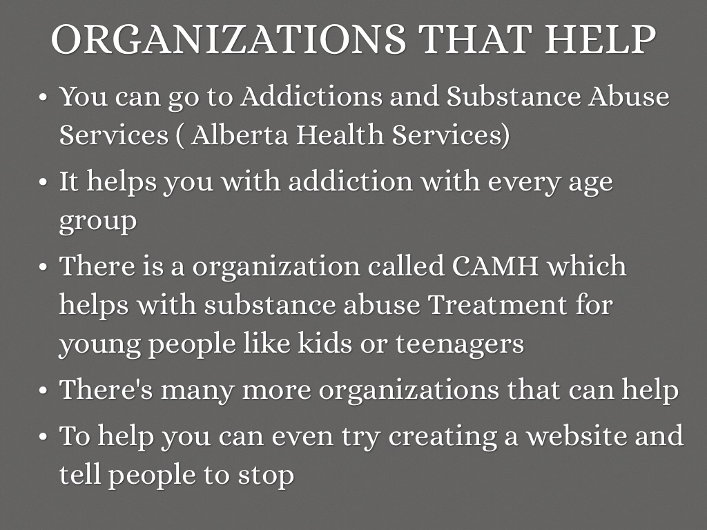 There is a organization called CAMH which helps with substance abuse Treatment for young people like kids or teenagers