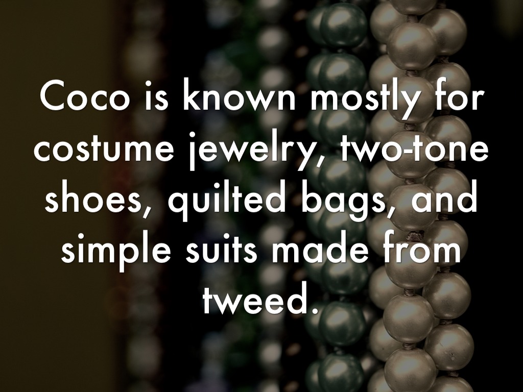 Coco is known mostly for costume jewelry, two-tone shoes, quilted bags, and simple suits made from tweed.