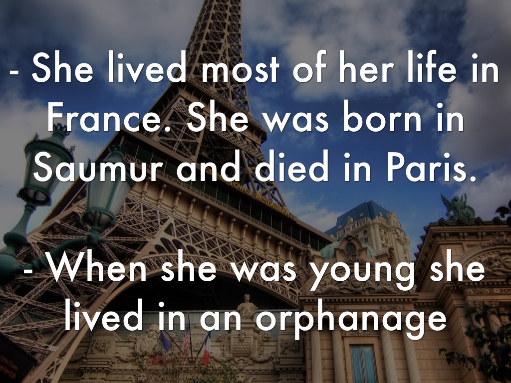 - She lived most of her life in France. She was born in Saumur and died in Paris.