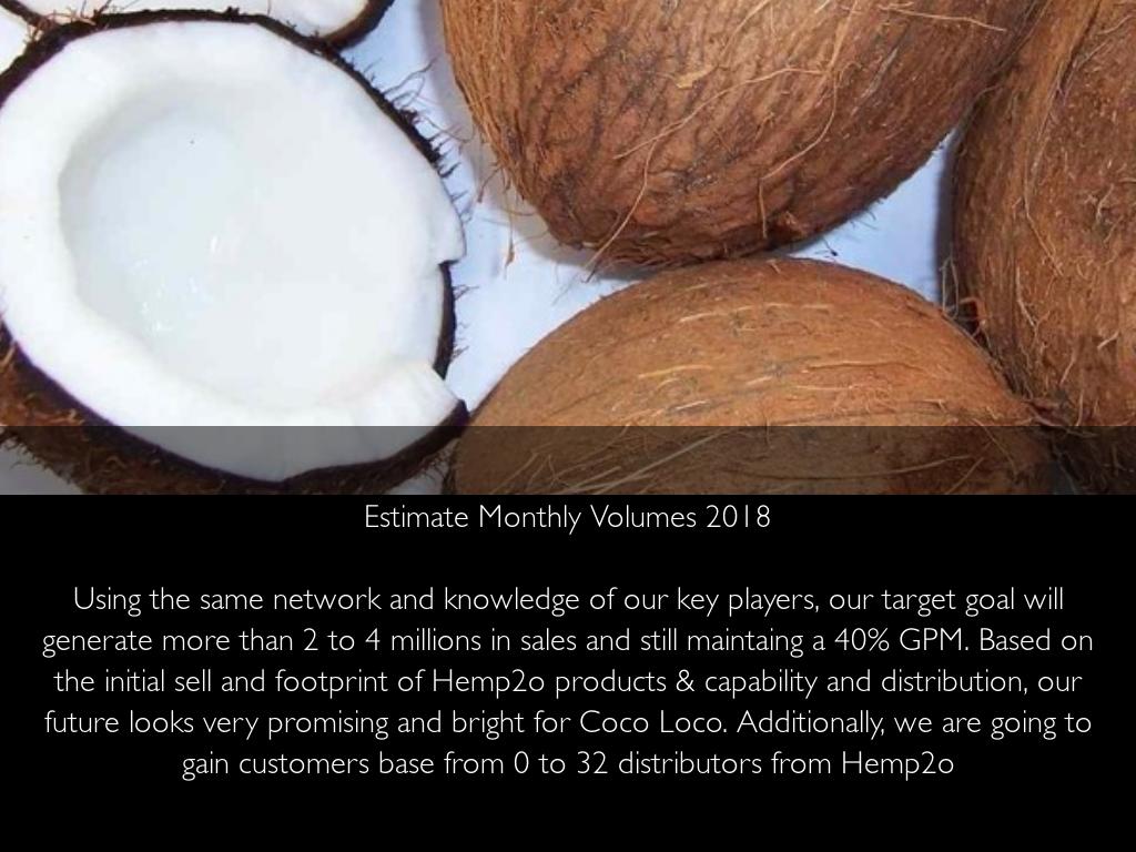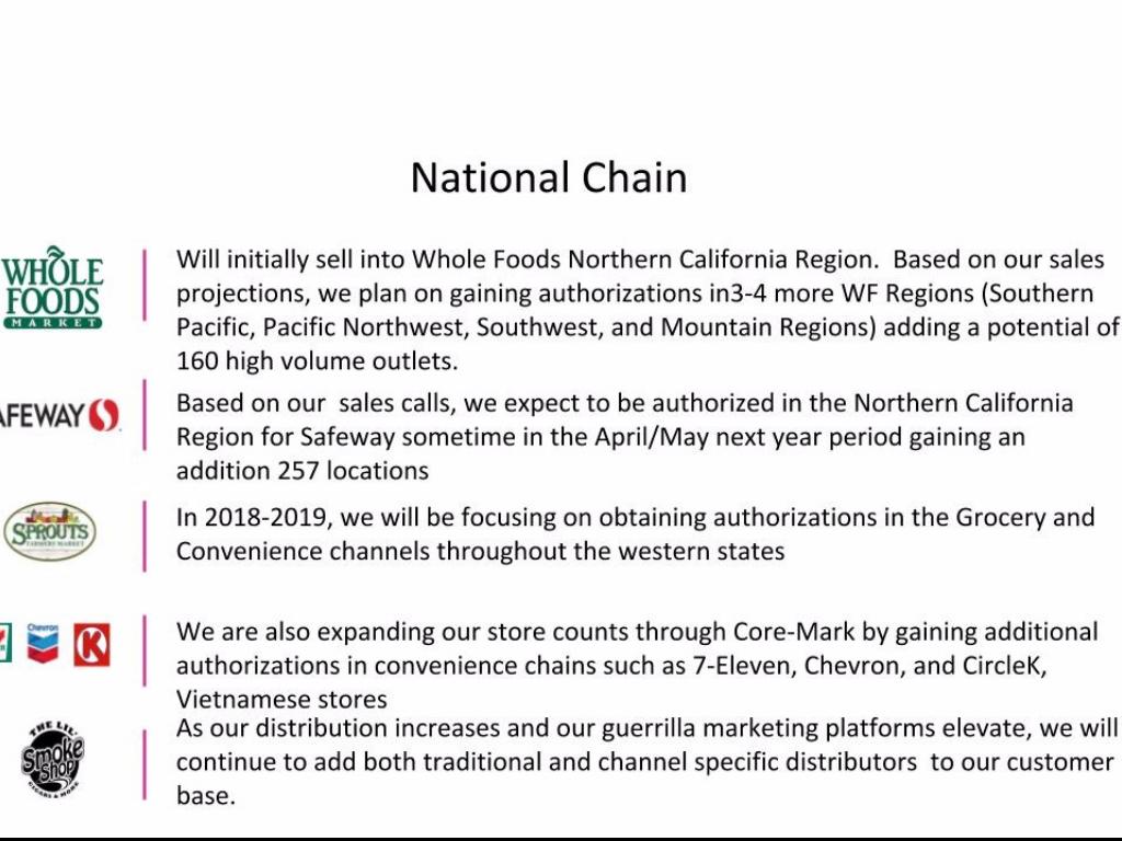Going to sign the biggest deal using Hemp2o network which is distributing 350 stores 7 Eleven, Humboldt Distributing, DSD Distributors in Norcal, and all over of West and East Coast.
