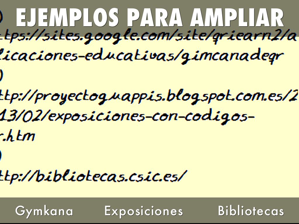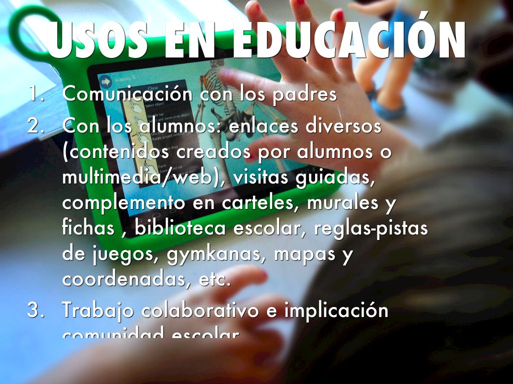 Con los alumnos: enlaces diversos (contenidos creados por alumnos o multimedia/web), visitas guiadas, complemento en carteles, murales y fichas , biblioteca escolar, reglas-pistas de juegos, gymkanas, mapas y coordenadas, etc.