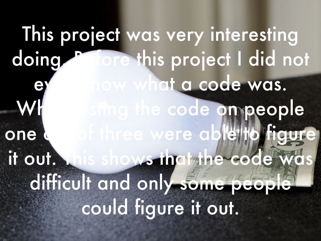This project was very interesting doing. Before this project I did not even know what a code was. While testing the code on people one out of three were able to figure it out. This shows that the code was difficult and only some people could figure it out.