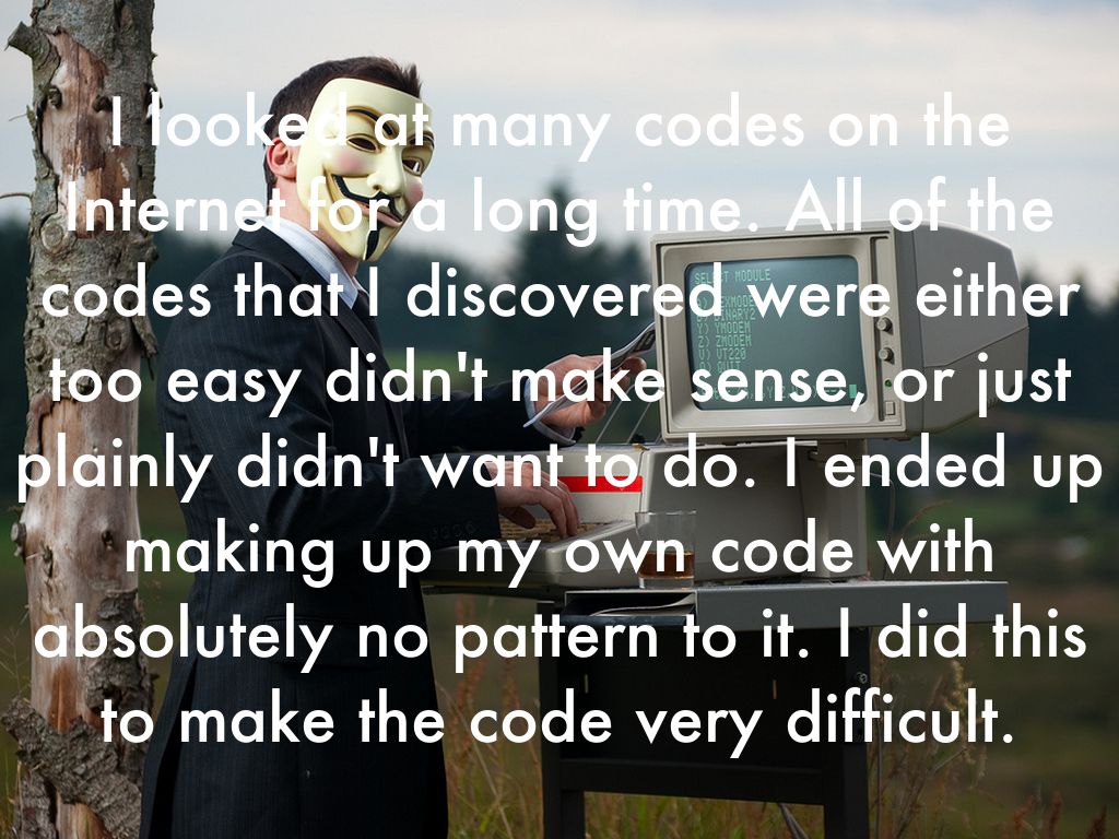 I looked at many codes on the Internet for a long time. All of the codes that I discovered were either too easy didn't make sense, or just plainly didn't want to do. I ended up making up my own code with absolutely no pattern to it. I did this to make the code very difficult.
