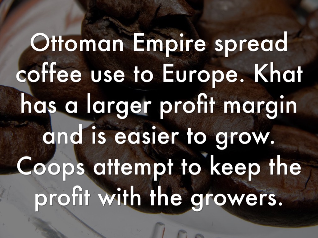 Ottoman Empire spread coffee use to Europe. Khat has a larger profit margin and is easier to grow. Coops attempt to keep the profit with the growers.