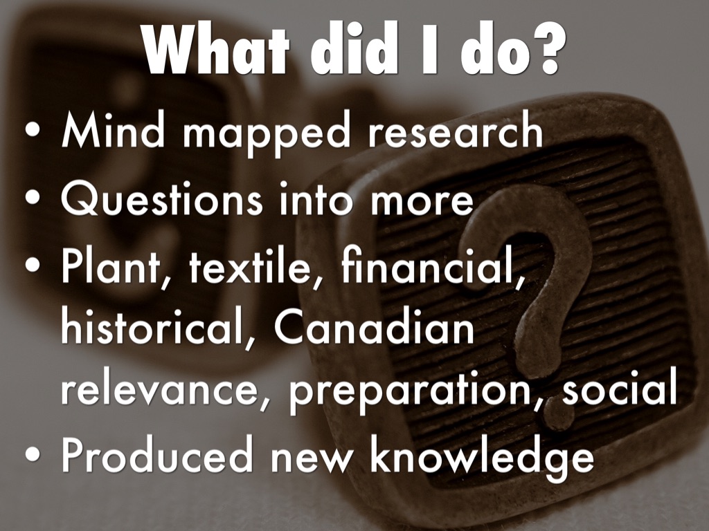 • Plant, textile, financial, historical, Canadian relevance, preparation, social