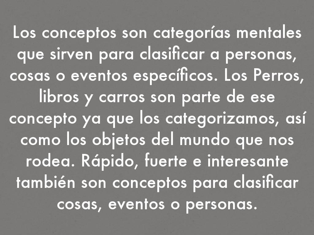 Los conceptos son categorías mentales que sirven para clasificar a personas, cosas o eventos específicos. Los Perros, libros y carros son parte de ese concepto ya que los categorizamos, así como los objetos del mundo que nos rodea. Rápido, fuerte e interesante también son conceptos para clasificar cosas, eventos o personas.