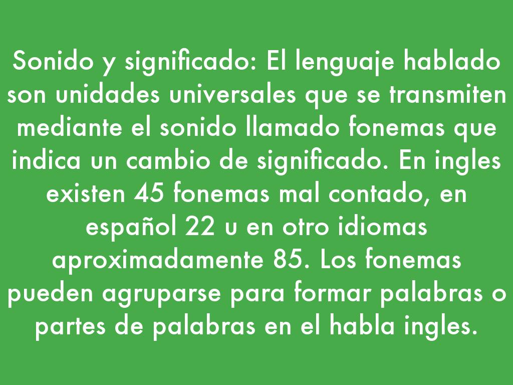 Sonido y significado: El lenguaje hablado son unidades universales que se transmiten mediante el sonido llamado fonemas que indica un cambio de significado. En ingles existen 45 fonemas mal contado, en español 22 u en otro idiomas aproximadamente 85. Los fonemas pueden agruparse para formar palabras o partes de palabras en el habla ingles.