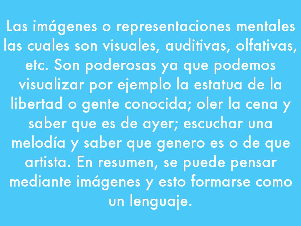 Las imágenes o representaciones mentales las cuales son visuales, auditivas, olfativas, etc. Son poderosas ya que podemos visualizar por ejemplo la estatua de la libertad o gente conocida; oler la cena y saber que es de ayer; escuchar una melodía y saber que genero es o de que artista. En resumen, se puede pensar mediante imágenes y esto formarse como un lenguaje.