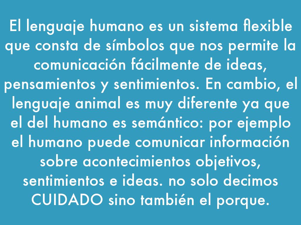 El lenguaje humano es un sistema flexible que consta de símbolos que nos permite la comunicación fácilmente de ideas, pensamientos y sentimientos. En cambio, el lenguaje animal es muy diferente ya que el del humano es semántico: por ejemplo el humano puede comunicar información sobre acontecimientos objetivos, sentimientos e ideas. no solo decimos CUIDADO sino también el porque.