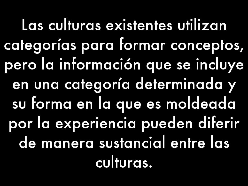 Las culturas existentes utilizan categorías para formar conceptos, pero la información que se incluye en una categoría determinada y su forma en la que es moldeada por la experiencia pueden diferir de manera sustancial entre las culturas.