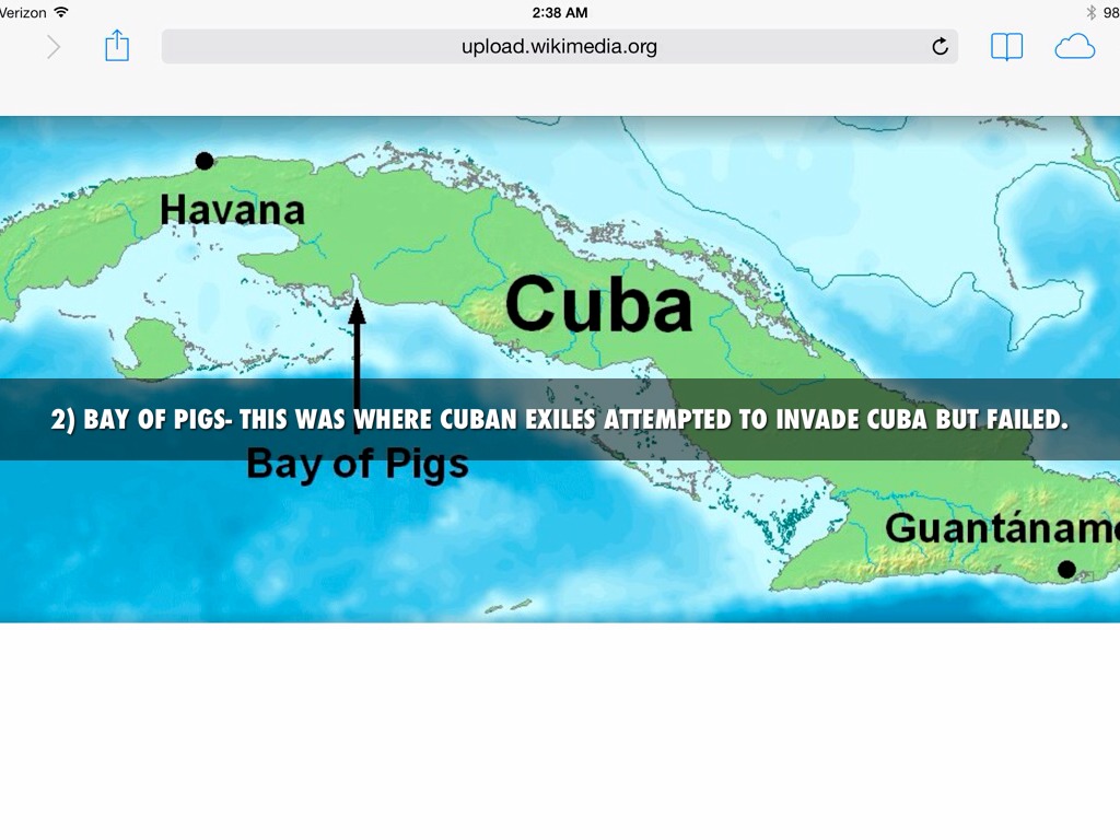 2) BAY OF PIGS- THIS WAS WHERE CUBAN EXILES ATTEMPTED TO INVADE CUBA BUT FAILED.
