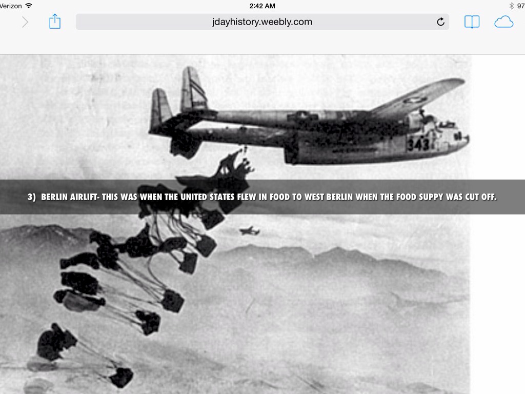 3) BERLIN AIRLIFT- THIS WAS WHEN THE UNITED STATES FLEW IN FOOD TO WEST BERLIN WHEN THE FOOD SUPPY WAS CUT OFF.