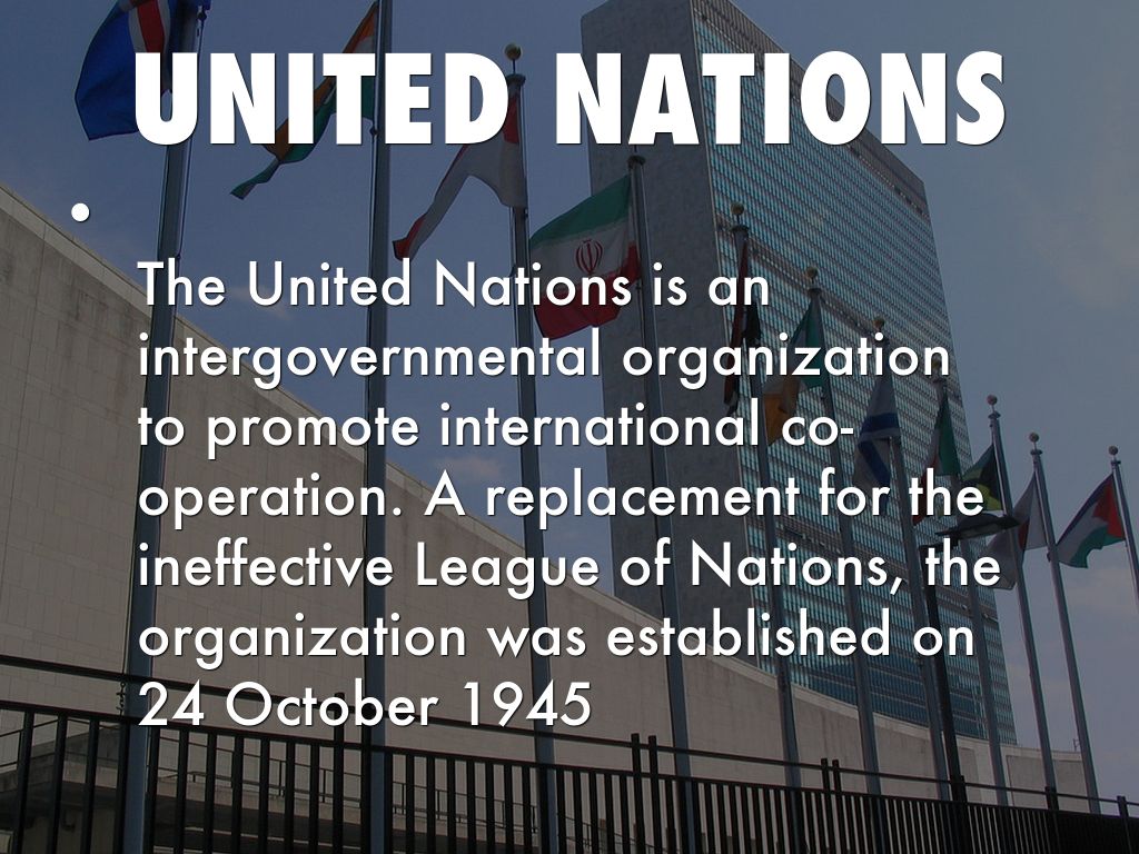 • The United Nations is an intergovernmental organization to promote international co-operation. A replacement for the ineffective League of Nations, the organization was established on 24 October 1945