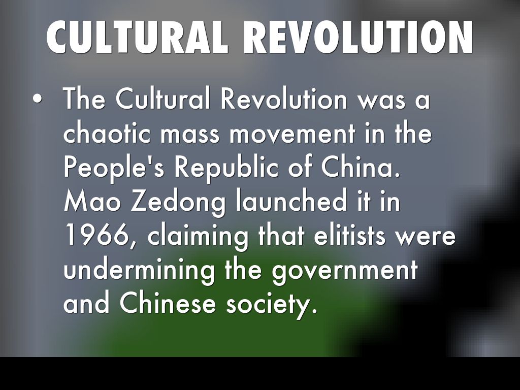 • The Cultural Revolution was a chaotic mass movement in the People's Republic of China. Mao Zedong launched it in 1966, claiming that elitists were undermining the government and Chinese society.