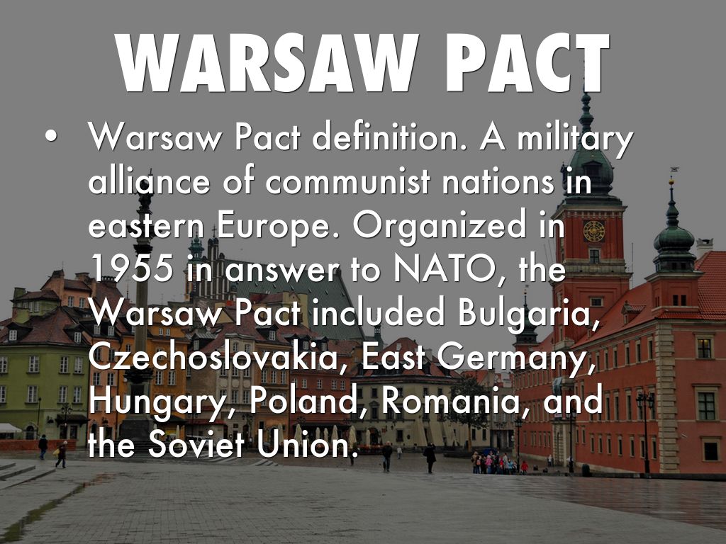 • Warsaw Pact definition. A military alliance of communist nations in eastern Europe. Organized in 1955 in answer to NATO, the Warsaw Pact included Bulgaria, Czechoslovakia, East Germany, Hungary, Poland, Romania, and the Soviet Union.