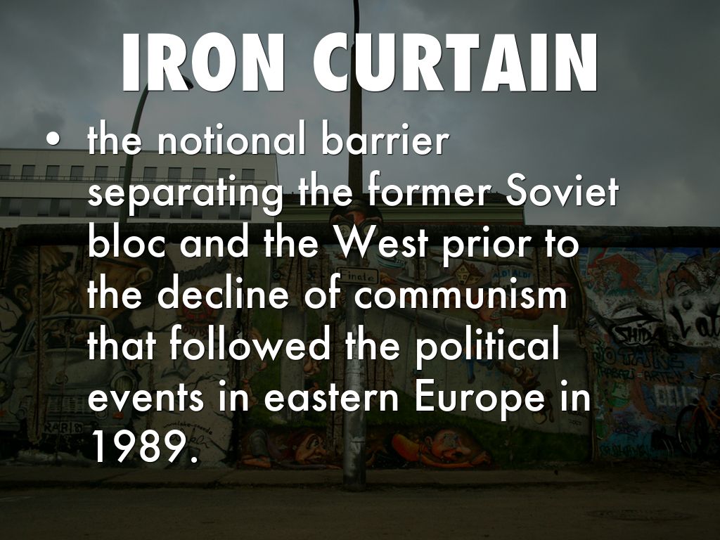 • the notional barrier separating the former Soviet bloc and the West prior to the decline of communism that followed the political events in eastern Europe in 1989.
