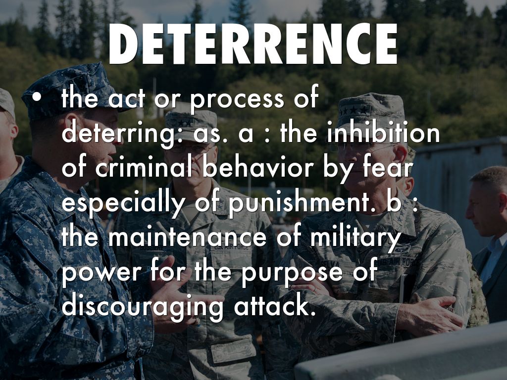 • the act or process of deterring: as. a : the inhibition of criminal behavior by fear especially of punishment. b : the maintenance of military power for the purpose of discouraging attack.