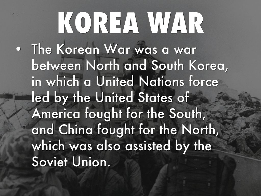 • The Korean War was a war between North and South Korea, in which a United Nations force led by the United States of America fought for the South, and China fought for the North, which was also assisted by the Soviet Union.