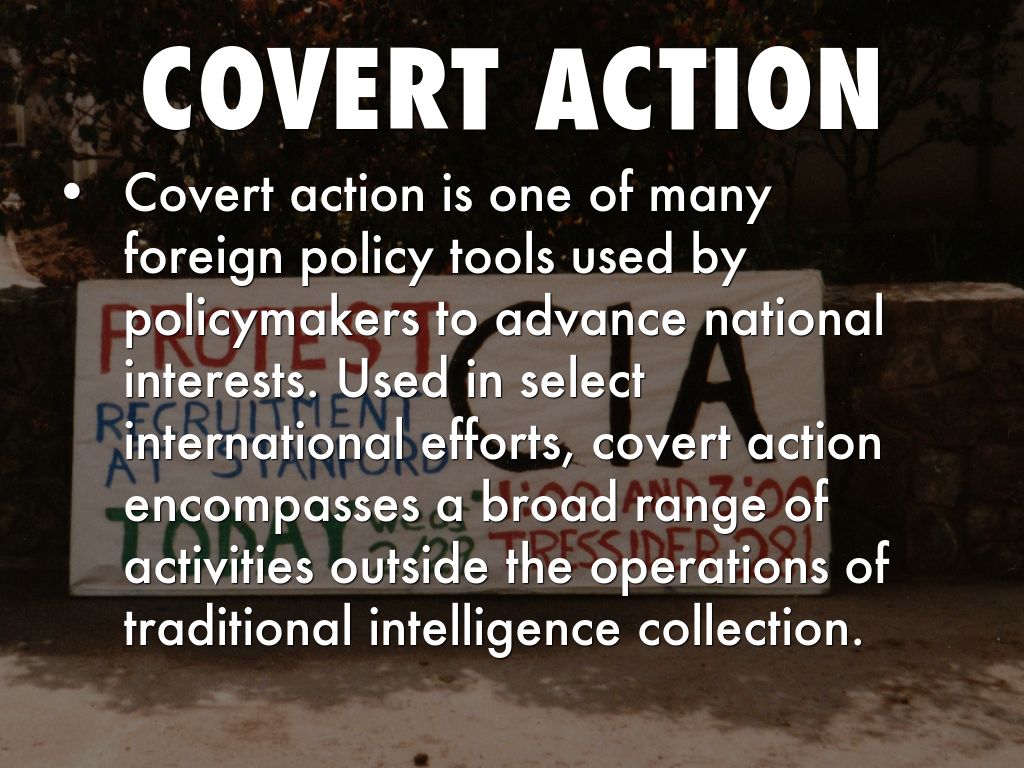 • Covert action is one of many foreign policy tools used by policymakers to advance national interests. Used in select international efforts, covert action encompasses a broad range of activities outside the operations of traditional intelligence collection.