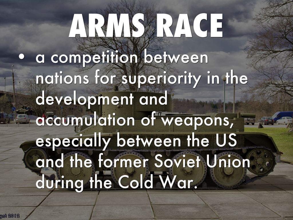 • a competition between nations for superiority in the development and accumulation of weapons, especially between the US and the former Soviet Union during the Cold War.