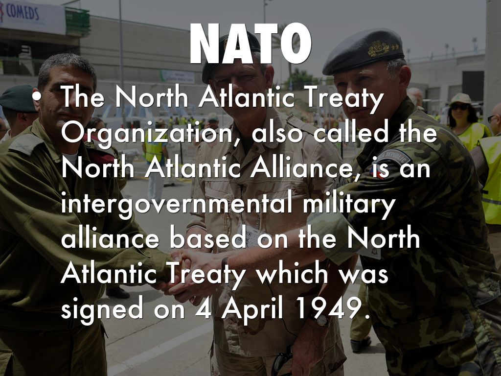 • The North Atlantic Treaty Organization, also called the North Atlantic Alliance, is an intergovernmental military alliance based on the North Atlantic Treaty which was signed on 4 April 1949.
