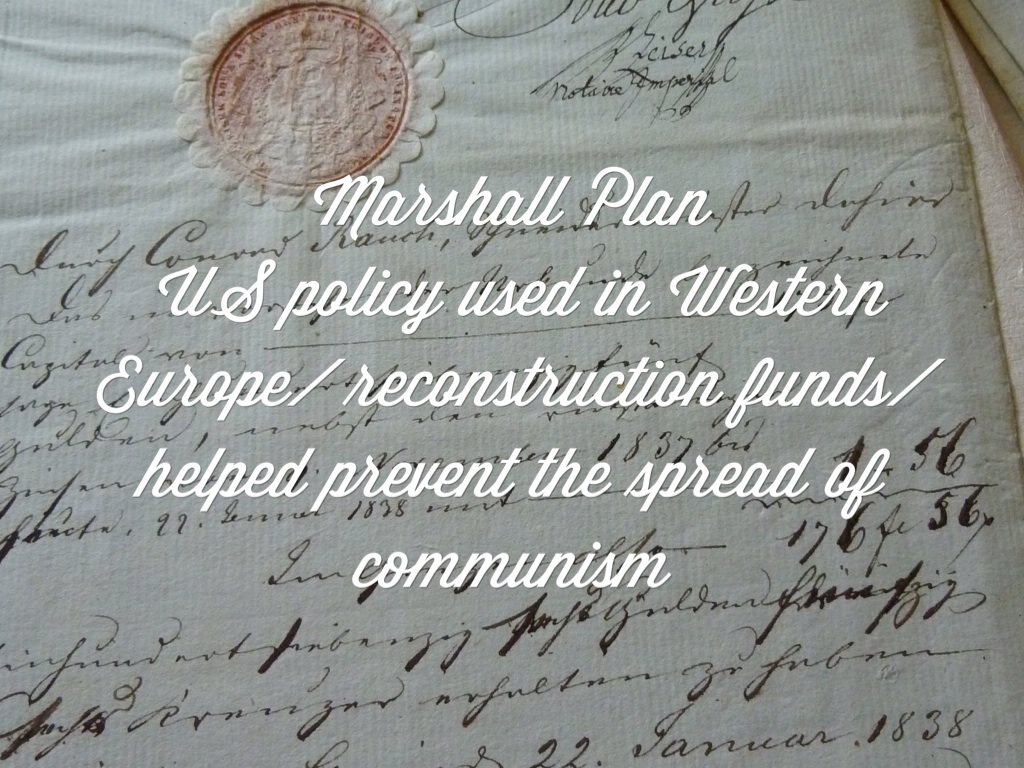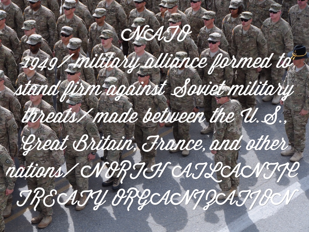 NATO 1949/ military alliance formed to stand firm against Soviet military threats/ made between the U.S., Great Britain, France, and other nations/ NORTH ATLANTIC TREATY ORGANIZATION