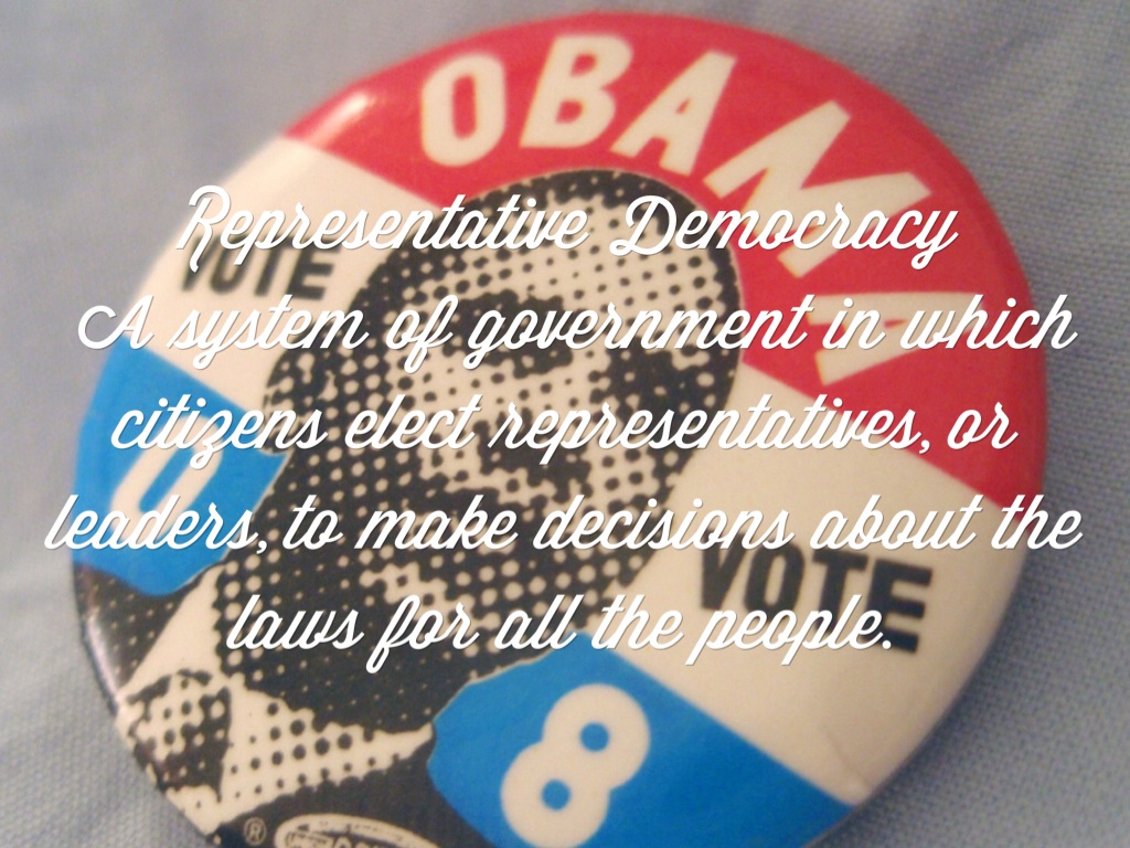 Representative Democracy A system of government in which citizens elect representatives, or leaders, to make decisions about the laws for all the people.