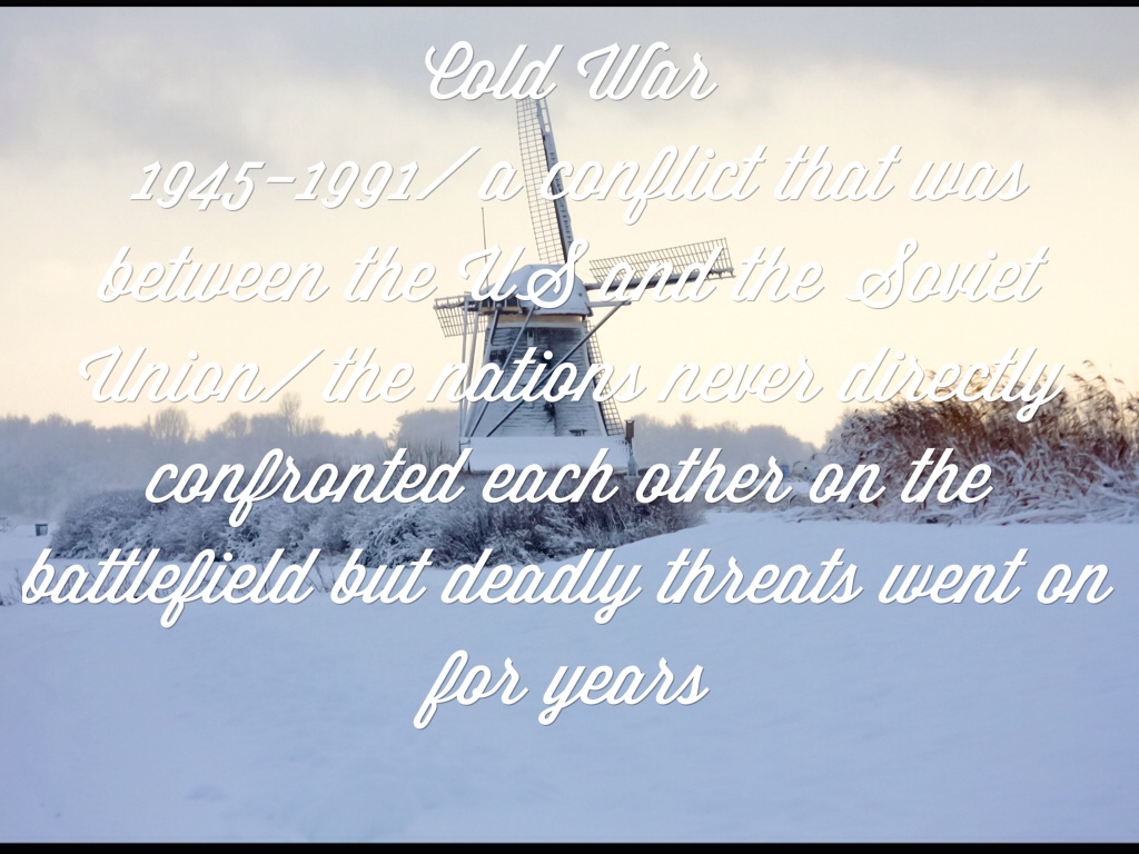 Cold War 1945-1991/ a conflict that was between the US and the Soviet Union/ the nations never directly confronted each other on the battlefield but deadly threats went on for years