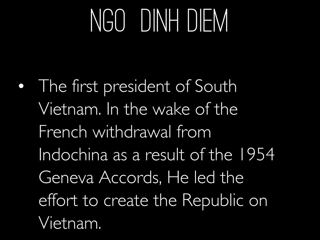The first president of South Vietnam. In the wake of the French withdrawal from Indochina as a result of the 1954 Geneva Accords, He led the effort to create the Republic on Vietnam.