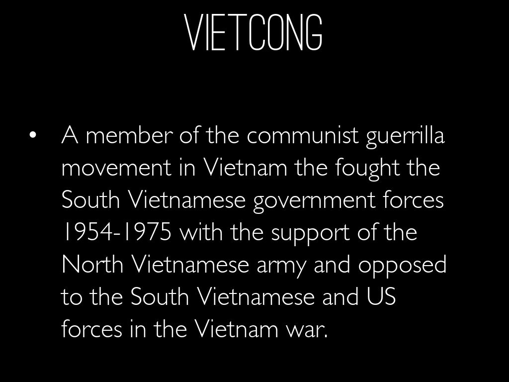 A member of the communist guerrilla movement in Vietnam the fought the South Vietnamese government forces 1954-1975 with the support of the North Vietnamese army and opposed to the South Vietnamese and US forces in the Vietnam war.