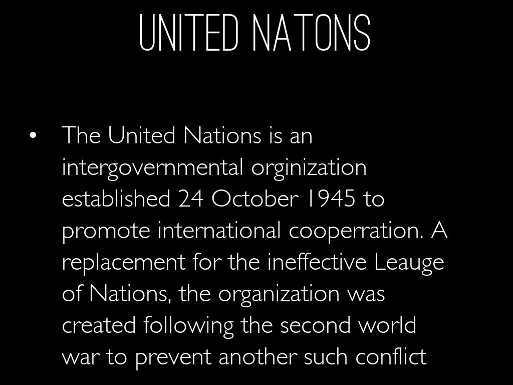 The United Nations is an intergovernmental orginization established 24 October 1945 to promote international cooperration. A replacement for the ineffective Leauge of Nations, the organization was created following the second world war to prevent another such conflict